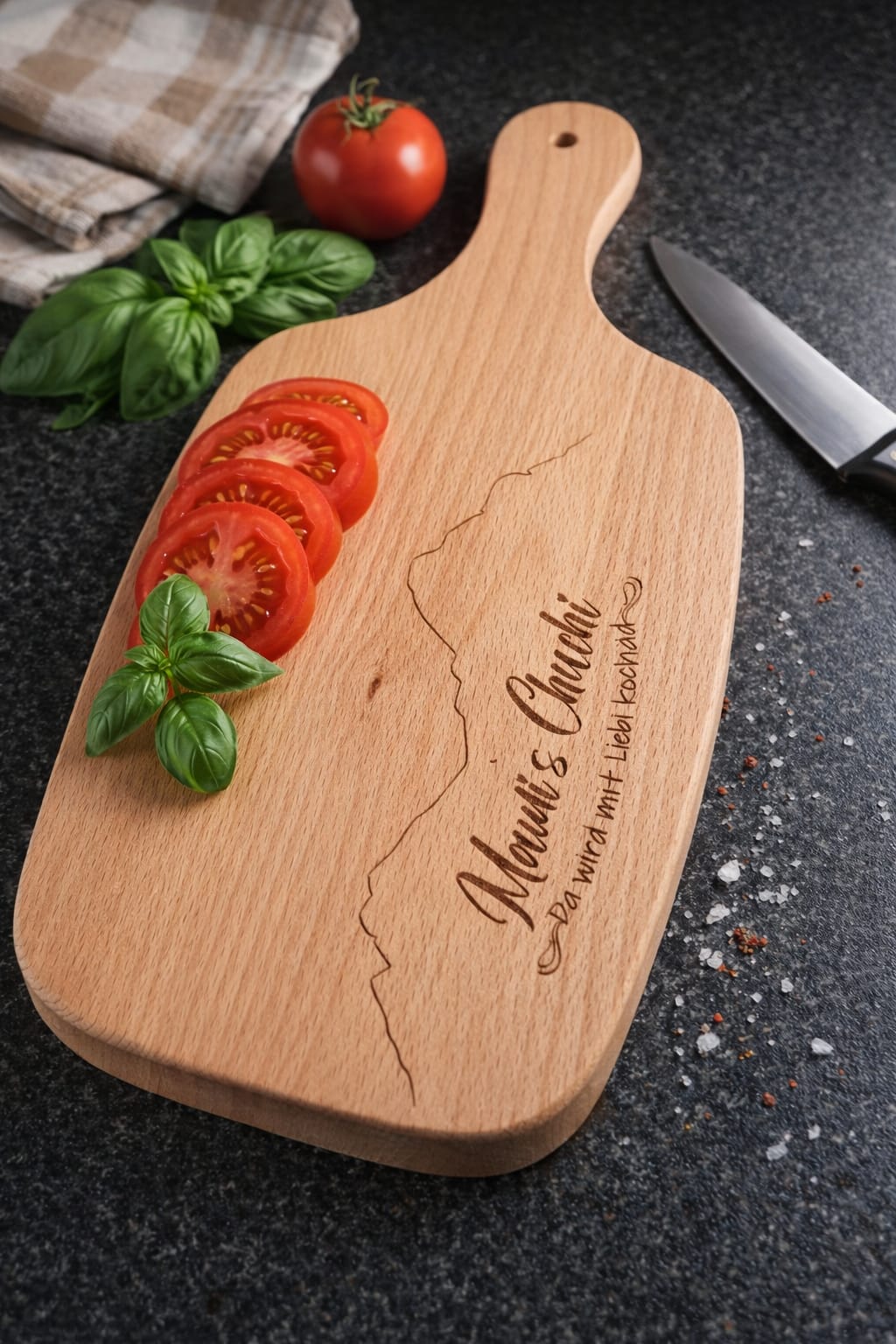 Ein herzliches Geschenk für die beste Köchin der Welt! Dieses hochwertige Schneidebrett aus massivem Buchenholz bringt Heimatgefühl und Liebe direkt in die Küche. Mit der stimmungsvollen Gravur der Mythen und dem liebevollen Spruch im Dialekt ist es ein echtes Unikat.
