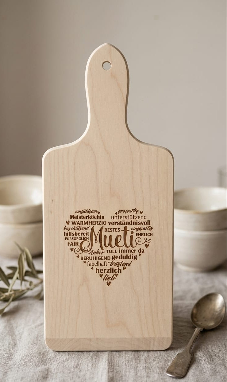 Holz-Schneidebrett aus Ahorn "Muetiherz / Mamiherz", 35 x 15 cm